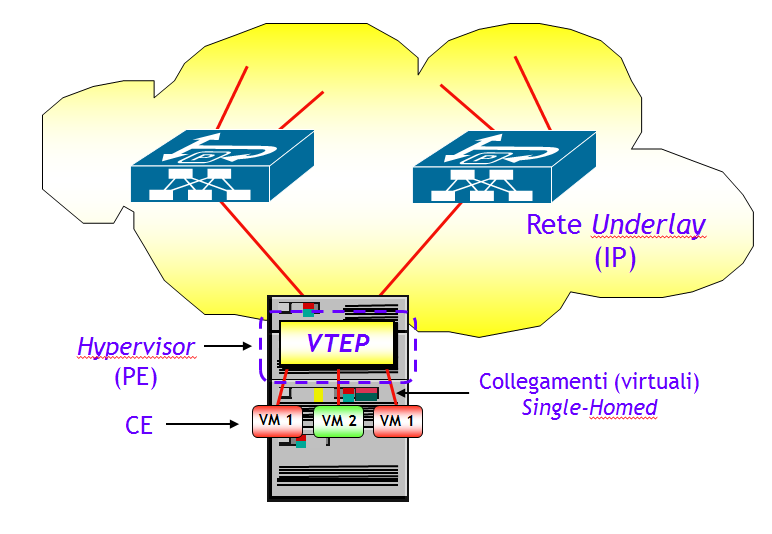 Quando, utilizzando la nomenclatura EVPN, PE e CE sono colocati sulla stessa macchina fisica, es. quando un PE, ossia la funzione VTEP, risiede in un server e i CE sono delle VM (Virtual Machine), i collegamenti PE-CE sono virtuali e tipicamente non sono multi-homed. Il caso pratico più comune di questo scenario si ha quando la funzione VTEP risiede in un Hypervisor.
